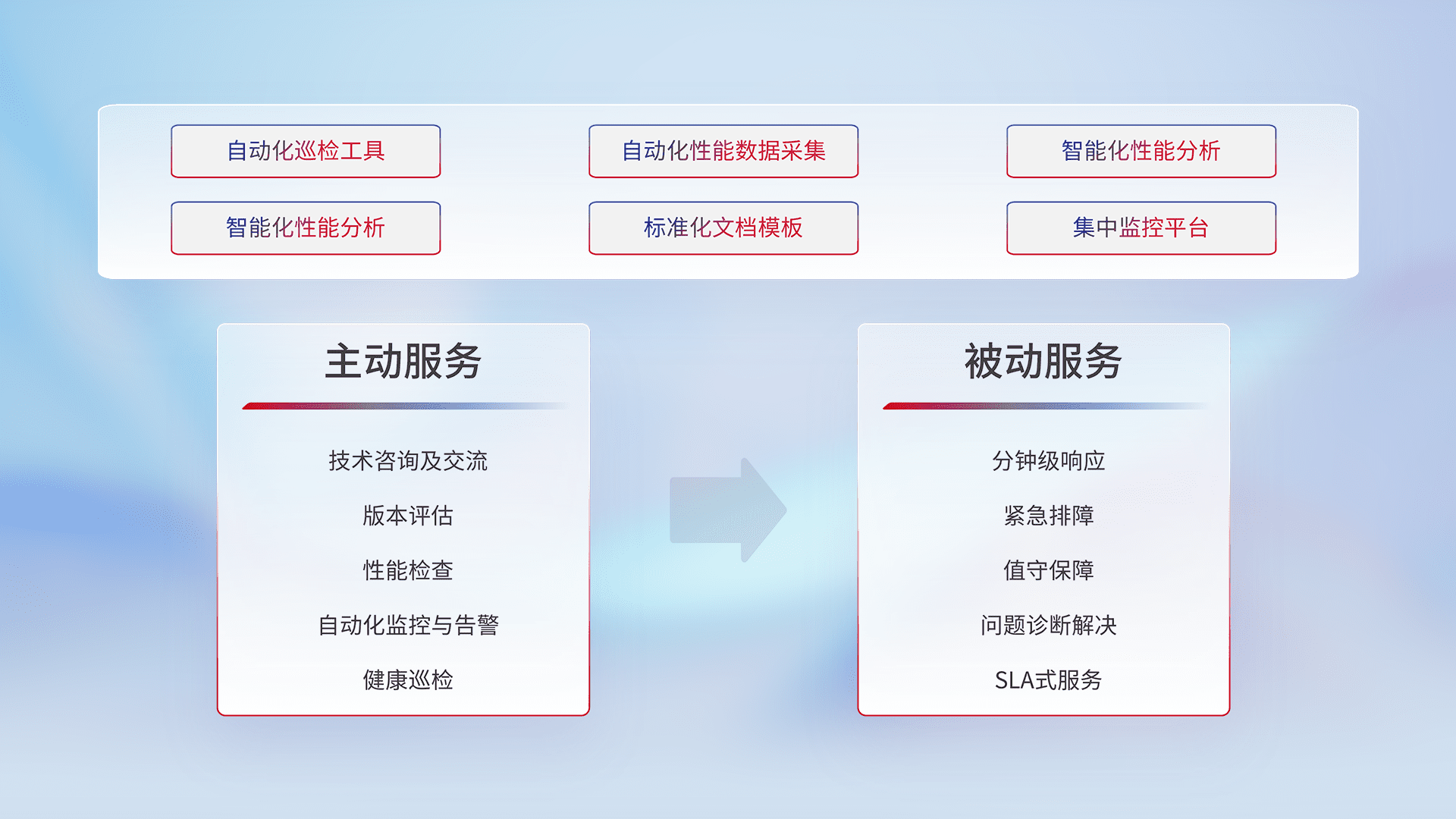 智能化工具和标准化文档,,,,保障服务质量,,提供主动服务(包含技术咨询、、、、版本评估、、、、性能检查、、、、自动化监控与告警、、健康巡检)和被动服务包含(分钟级响应、、、紧急排障、、、值守保障、、问题诊断解决、、SLA服务)。。。。